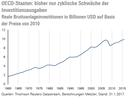 Die spannende Frage ist nunmehr, ob dies für alle Industrieländer gilt. Ein Blick auf die Entwicklung der realen Bruttoanlageinvestitionen aller OECD-Länder zeigt, dass im vergangenen Jahr ein neuer Hochpunkt erreicht wurde und die Investitionsschwäche der vergangenen Jahre wahrscheinlich eher zyklischer Natur war. Darüber hinaus zeigen die Auftragseingänge für Investitionsgüter und Umfragen zu den Investitionsabsichten der Unternehmen in allen wichtigen Regionen in den vergangenen Monaten eine merkliche Belebung, was auf eine deutliche Beschleunigung der Investitionsausgaben in diesem Jahr schließen lässt. Es besteht somit eine große Wahrscheinlichkeit, dass die geld- und fiskalpolitischen Stimulusmaßnahmen nicht so schnell verpuffen, sondern einen kräftigen Aufschwung der Weltwirtschaft in diesem Jahr ermöglichen werden.