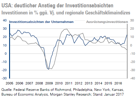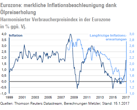 Gleichzeitig ist weltweit eine Normalisierung der Inflation zu beobachten. In den USA stieg die Inflationsrate von 0,8 % im Juli 2016 auf 2,1 % im Dezember und in der Eurozone von -0,2 % im April 2016 auf 1,8 % im Januar 2017. Interessanterweise sind in der Eurozone zuletzt auch die langfristigen Inflationserwartungen gestiegen, wobei diese eigentlich nicht auf den Basiseffekt höherer Ölpreise reagieren sollten. Vielleicht sorgen die guten Konjunkturdaten für ein größeres Vertrauen bei den Unternehmen, Preiserhöhungen am Markt durchsetzen zu können. Zumal die Kapazitätsauslastung in der Eurozone in der Umfrage zu Jahresanfang 2017 auf 82,5 % gestiegen ist und somit über dem langfristigen Durchschnitt von etwa 81 % liegt. Dementsprechend sehen wir gute Chancen, dass die Kerninflation in der Eurozone in den kommenden Monaten merklich steigt.