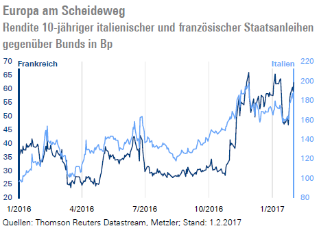 Der große Unsicherheitsfaktor sind die politischen Risiken. So ist die Wirtschafts- und Außenpolitik Donald Trumps immer noch unklar – sie könnte in den kommenden Wochen immer wieder für Konflikte und Unruhe sorgen, insbesondere die Anordnung von protektionistischen Maßnahmen. Europa befindet sich nach dem Brexit-Referendum an einem Scheideweg und die Bevölkerungen in Holland, Frankreich, Italien (wahrscheinlich) und Deutschland müssen bei den Wahlen zeigen, ob sie noch mehrheitlich hinter dem europäischen Integrationsprojekt stehen. Die hohe Unsicherheit über die Zukunft Europas spiegelt sich auch langsam an den Finanzmärkten wider. So sind die Renditen von italienischen und französischen Staatsanleihen in den vergangenen Wochen deutlich stärker gestiegen als die von deutschen Bundesanleihen. Italien und Frankreich müssen also eine deutlich gestiegene Risikoprämie für die Schuldenaufnahme bezahlen.