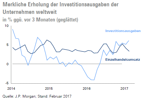 In den USA scheint sich das Muster der vergangenen Jahre zu wiederholen: Obwohl die Daten saisonal bereinigt sind, wuchs die US-Wirtschaft in den vergangenen Jahren immer im ersten Quartal schwach und beschleunigte sich in den folgenden beiden Quartalen. Offensichtlich gibt es Probleme mit den Verfahren der saisonalen Bereinigung, die auch in diesem Jahr nur ein Wirtschaftswachstum (Freitag) von 1,0 % im ersten Quartal 2017 zulassen könnten. Nichtsdestotrotz sind die Konjunkturperspektiven nach wie vor gut, wie ein hohen Konsumentenvertrauen (Dienstag und Freitag) sowie steigende Neubauverkäufe (Dienstag) zeigen dürften. Entscheidend für den Ausblick sind jedoch die Investitionsausgaben, die im vergangenen Jahr noch sehr schwach waren und sich zuletzt langsam erholten. Ein weiterer Anstieg der Auftragseingänge (Donnerstag) für Investitionsgüter wäre daher ein wichtiges Signal. Immerhin steigen schon in den vergangenen Monaten die tatsächlichen Investitionsausgaben der Unternehmen auf globaler Ebene merklich, nachdem sie noch im vergangenen Jahr stark gefallen waren.