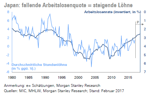 In Japan scheint sich langsam eine Trendwende bei der Lohnentwicklung abzuzeichnen. So geht der Rückgang der Arbeitslosenquote (Freitag) mit steigenden Löhnen einher.