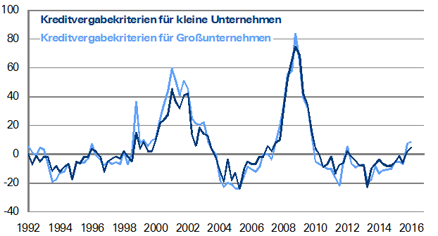Darüber hinaus verschärften die amerikanischen Geschäftsbanken die Kreditvergabekriterien für Firmen nunmehr das zweite Quartal in Folge. Die Kreditvergabekriterien sind ein Frühindikator für die Investitionsausgaben und die Kreditausfälle – die Verschärfung lässt auf einen Anstieg der Kreditausfälle in den kommenden Monaten und auf eine anhaltend schleppende Investitionstätigkeit der Unternehmen schließen.