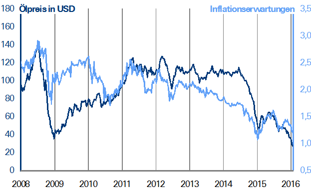 Eigentlich ist es überraschend, dass die EZB die Geldpolitik im März erneut lockern möchte – in einem Umfeld, in dem die gute konjunkturelle Lage einen Rückgang der Arbeitslosenquote auf 10,4 % im Dezember 2015 von noch 11,4 % im Dezember 2014 ermöglichte. Aus Sicht der EZB sind die Inflationserwartungen jedoch nicht mehr verankert, sondern waren zuletzt hoch mit der Ölpreisentwicklung korreliert.