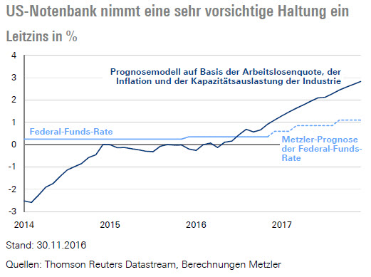 Ein Prognosemodell auf Basis der Arbeitslosenquote, der Kapazitätsauslastung und der Inflation zeigt, dass die US-Notenbank in der Vergangenheit in einem ähnlichen makroökonomischen Umfeld den Leitzins im Dezember schon auf 1,1 % erhöht hätte und bis Ende 2017 sogar auf 2,8 % - bei einer BIP- und Inflationsprognose von 2,2 % und 2,5 % für 2017.