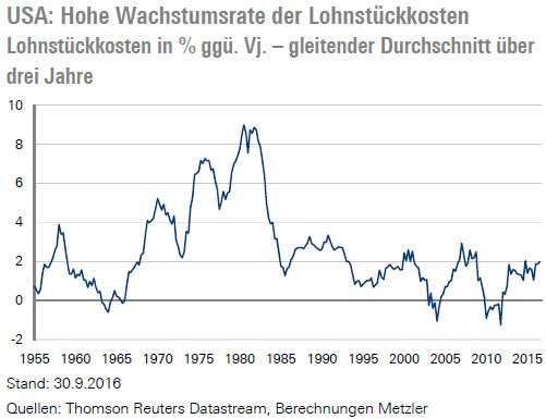 In den vergangenen Quartalen beschleunigte sich die Wachstumsrate der Lohnstückkosten merklich auf 2,0 %, sodass einhergehend mit einer anhaltenden Verbesserung am US-Arbeitsmarkt mit steigendem Lohndruck auf die Kerninflation zu rechnen ist.