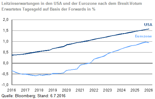 Es wird noch einige Wochen dauern, bis die Folgen für die Realwirtschaft nach dem Brexit-Schock in den Konjunkturdaten sichtbar werden. Erkennbar ist jedoch schon jetzt, dass die Finanzmarktakteure mit einer deutlich expansiveren Geldpolitik rechnen und auch mit deutlich niedrigeren Leitzinsen als vor dem Brexit-Referendum.