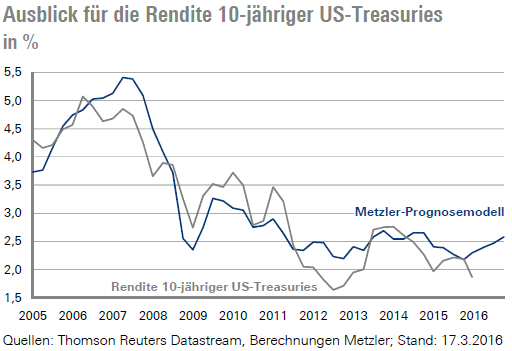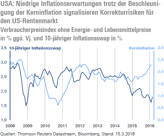 In den vergangenen Wochen verbesserten sich jedoch die Konjunkturdaten in den USA merklich, sodass die Abwärtsrisiken für unsere Wachstumsprognose von 2,0 % deutlich geringer geworden sind. Ein Wirtschaftswachstum von 2,0 % steht im Einklang mit einem Rückgang der Arbeitslosenquote auf 4,5 % im Jahresverlauf 2016 und mit einer weiteren Beschleunigung der Lohndynamik. Eine daraus resultierende anhaltend steigende Kerninflation könnte in den kommenden Monaten zu einer dramatischen Neueinschätzung des langfristigen Inflationstrends und zu einem kräftigen Anstieg der langfristigen Inflationserwartungen führen. In diesem Fall könnte die Rendite 10-jähriger US-Treasuries von derzeit etwa 1,9 % schnell auf 2,6 % steigen.