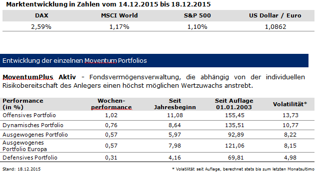 Die vergangene Handelswoche war voll mit wichtigen ökonomischen Daten und Ereignissen. An vorderster Stelle ist die erste Zinsanhebung durch die Fed seit mehr als 9 Jahren zu nennen. Aufgrund der positiven Entwicklung der US-Wirtschaft und dem Rückgang preisdämpfender Effekte beschloss das FOMC eine Erhöhung des Leitzinskorridors um 25bp mit einer Obergrenze von nun 0,50 Prozent.