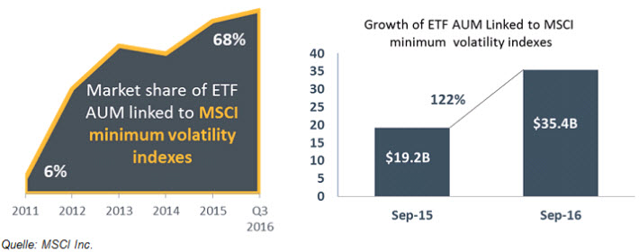 Insgesamt wird inzwischen weltweit ein Vermögen von mehr als 170 Milliarden US-Dollar mit MSCI-Faktor-Indizes als Vergleichsindex verwaltet. Sehr stark angestiegen ist nach Angaben von MSCI auch das mit seinen Minimum-Volatility-Indizes als Vergleichsindex angelegte Vermögen, und zwar um 122% auf 35,4 Milliarden US-Dollar gegenüber dem Vorjahr. Unter dem Strich haben etwa 68% aller Low-Volatility-ETFs rund um den Globus einen MSCI-Index als Benchmark. Damit ist MSCI in dieser Indexkategorie Weltmarktführer.