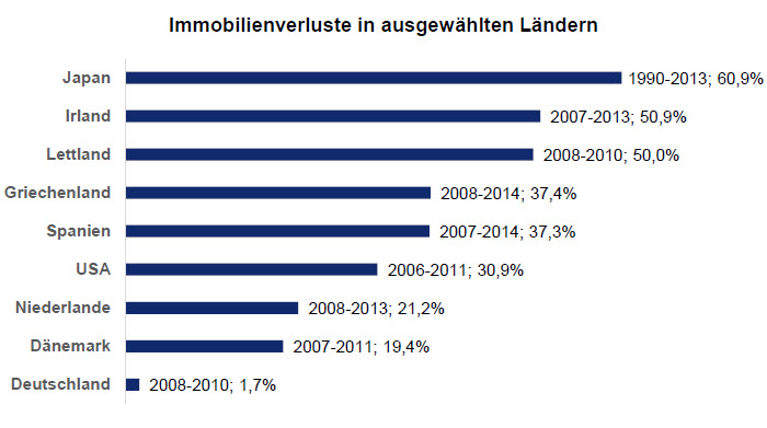 In Deutschland waren die Immobilienpreise sehr geringen Preisrückgängen ausgesetzt. Global betrachtet ist dies jedoch die Ausnahme und nicht die Regel. Auch deutsche Immobilienbesitzer müssen deshalb akzeptieren, dass es keine Sicherheit vor Verlusten gibt. Der heutige Wert jeder Anlage, und dazu gehören auch Immobilien, beruht auf den erwarteten Erträgen, die notwendigerweise in der Zukunft liegen und unsicher sind. Die wertstabile Geldanlage, auch die in Immobilien, ist eine Illusion.