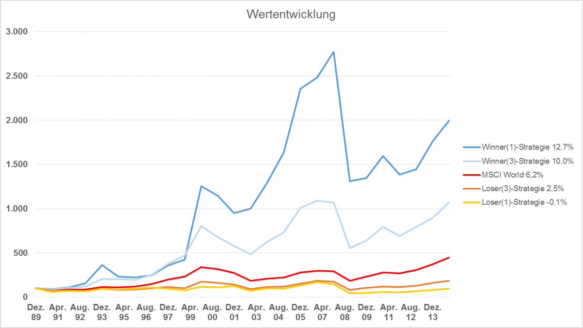 Plötzlich holt Anne Statistikow, die jedes Jahr die Diskussion zur Silvesterfeier miterleben musste, einen kleinen Zettel mit einer Grafik aus ihrer Tasche und zieht die Aufmerksamkeitauf sich: „Seit 25 Jahren diskutiert ihr das Für und Wider eurer Strategien. Ich dagegen möchte Fakten sprechen lassen. Deshalb habe ich mir in dieser Zeit Avandgardus Aktienempfehlungen notiert und daraufhin ein Portfolio gebildet, welches das schlechteste bzw. die drei schlechtesten Industrieländer beinhaltet (Loser-Strategie). In gleicher Weise bildete ich selbstverständlich auch Trendys Portfolio, das mit dem Land mit der besten bzw. den drei Industrieländern mit den höchsten Vorjahres-Wertentwicklungen gewichtet war (Winner-Strategie). Und siehe da, nach 25 Jahren bei jährlicher Anpassung steht der Gewinner fest…“