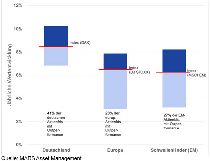 Die Geschwindigkeit der Informationsverarbeitung zu messen, gestaltet sich als problematisch. Wir gehen daher einen anderen Weg und betrachten die Ergebnisse der Fondsmanager: Die Bilanz der letzten Jahre zeigt ein überraschendes Bild. Vergleicht man die 3 „Aktienteiche“ Deutschland, Europa und Schwellenländer miteinander, dann liegt der jeweilige Index auf unterschiedlichem Niveau innerhalb des Fondsuniversums. Während 41 Prozent der deutschen Aktienfonds eine Outperformance gegenüber dem DAX erzielten, lag dieser Wert bei den Schwellenländern nur bei 27 Prozent. Rückblickend betrachtet war somit die Outperformance in den Schwellenländern seltener als in Europa. Dieses Ergebnis spricht nicht dafür, dass Schwellenländer intransparenter sind als Industrienationen.