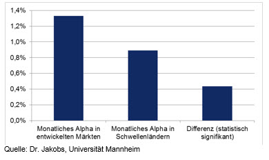 In einer zweiten Betrachtung können wir indirekt herausfinden, in welchem Markt bekannte Anomalien und Fehlbewertungen weiterhin funktionieren. Dafür müssen sogenannte Faktorportfolios auf Basis der Marktkapitalisierung, Bewertung, Wachstum- und Finanzierungsinformationen gebildet werden. Diese Long/Short-Alphas bilden Fehlbewertungen sowohl in den entwickelten Märkten als auch Emerging Markets ab. Im Ergebnis ist die Performance dieser Faktoren in entwickelten Märkten höher als in Schwellenländern. Damit bestätigt sich das Bild aus der Betrachtung der Fondsperformance.