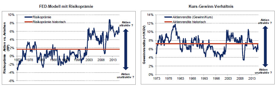 Die Renditen von Aktien und Anleihen werden mit dem sogenannten FED-Modell verglichen. Werfen Dividendenpapiere mehr als Anleihen ab, sind Aktien attraktiv und umgekehrt. Die Differenz aus den Gewinnrenditen (=1/KGV) und Anleiherenditen ergibt die Risikoprämie. Für den deutschen Aktienmarkt beträgt die Gewinnrendite 5,8% (=1/17,3). Die Staatsanleihenverzinsung, gemessen am REX, beläuft sich auf 0,1%. Daraus ergibt sich die Risikoprämie in Höhe von 5,7% (= 5,8% minus 0,1%).