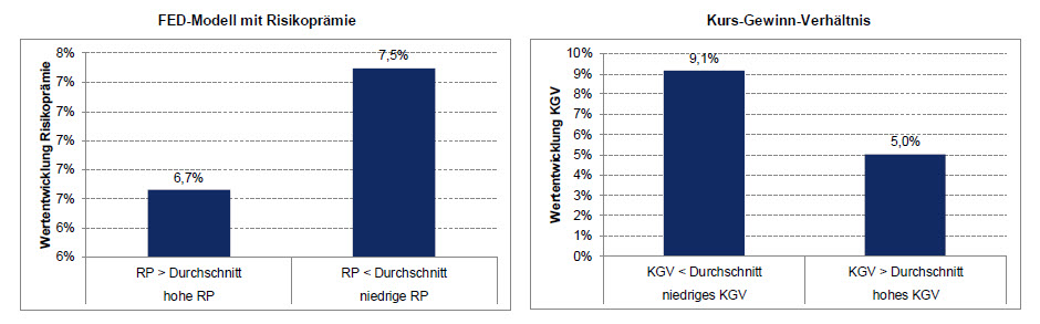 In Zeiten hoher Risikoprämien konnte der DAX seit 1973 eine jährliche Wertentwicklung von 6,7% erzielen. Bei niedrigen Risikoprämien war überraschenderweise die Wertentwicklung nicht niedriger, sondern mit 7,5% höher als in Phasen hoher Risikoprämie. Das traditionelle Kurs-Gewinn-Verhältnis hat dagegen eine positive Prognosegüte, da bei niedrigem KGV eine bessere zukünftige Wertentwicklung erzielt wird als bei niedrigen Werten (siehe nachfolgende Grafik).