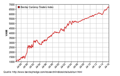 Währungsindizes wie der Barcalys Currency Traders Index, der die Wertentwicklung von mehreren Händlern abbildet, weisen ebenfalls eine beachtliche Performance von 6,6% p.a. bei geringen Schwankungen und Rückschlägen seit 1987 auf.