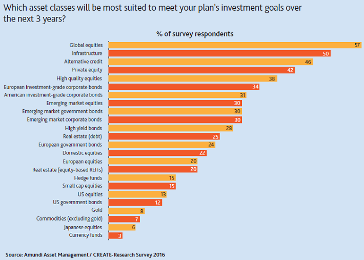 Die Pensionsmanager ziehen ihre Konsequenzen aus den sinkenden Renditen am Anleihenmarkt. Sie favorisieren für die kommenden drei Jahre vor allem globale Aktien (57 %) und Infrastruktur (50 %), gefolgt von Alternative Credit (46 %) und Private Equity (42 %).
