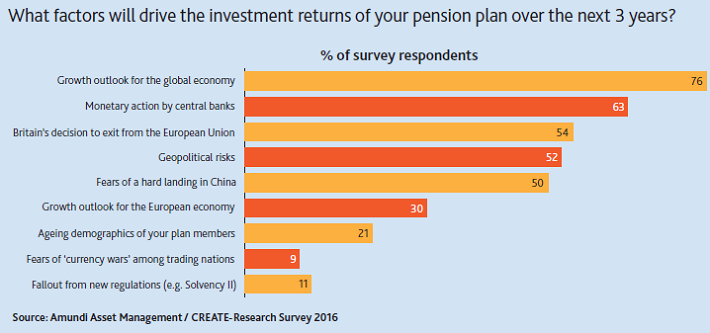 Brexit als Startschuss für mehr Nationalismus in EuropaIn der Zukunft erwarten die Pensionskassen-Verantwortlichen, dass sich vom Brexit ausgehend nationalistische und protektionistische Tendenzen ausbreiten. Diese politischen Risiken werden den Aussagen zufolge einen größeren Einfluss als die Gewinnsituation der Unternehmen haben. Das macht den Pensionskassen-Managern zunehmend Probleme: Wo sie noch Renditen erwirtschaften können, sei ihnen unklar. Und die positiven Auswirkungen der ultra-lockeren Zentralbankpolitik schwinden zusehends, so das Ergebnis der Befragung.