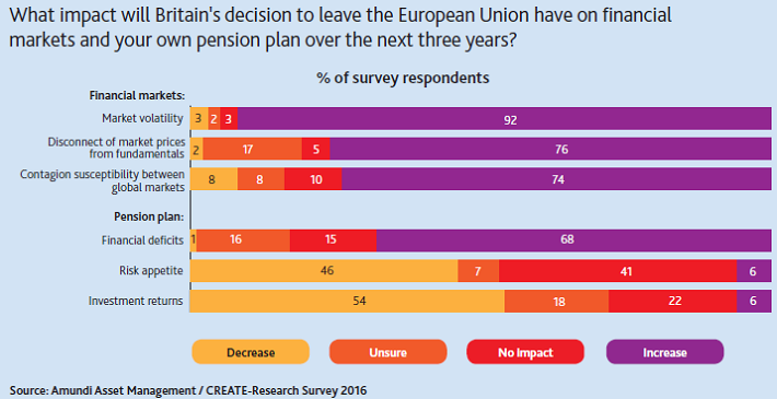 Die Ergebnisse der Umfrage machen deutlich, dass der Einfluss der Politik auf die Finanzmärkte zuletzt deutlich zugenommen hat. So stellt etwa das Brexit-Votum den Aussagen zufolge einen großen Unsicherheitsfaktor dar. Die Finanzexperten gehen mehrheitlich davon aus, dass der Brexit das globale Wachstum bremsen werde, während die Asset-Preise weiter künstlich durch die ultra-lockere Geldpolitik aufgebläht würden. 92 % der Umfrageteilnehmer erwarten aufgrund des Ausscheidens Großbritanniens aus der Europäischen Union während der kommenden drei Jahre volatilere Märkte.