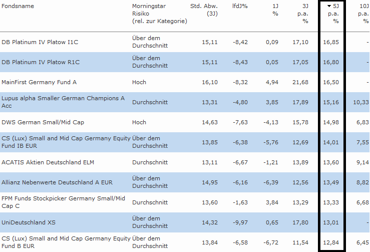 Unter den derzeit besten Fonds für deutsche Nebenwerte ist bemerkenswerterweise auch ein weiterer Fonds aus dem Hause DWS, der German Small/Mid Cap, der im laufenden Jahr, im Dreijahres- und im Fünfjahresvergleich sogar eine bessere Performance aufweist als der DWS Aktien Strategie Deutschland.