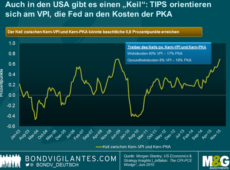 Eine ähnliche Keilentwicklung droht in den USA und zwar aus ähnlichem Grund wie in Großbritannien: TIPS sind an die Entwicklung des VPI gebunden, während sich die 2%-Zielmarke der Fed auf die privaten Konsumausgaben (PKA) bezieht. Auch hier basieren die zwei Indizes auf unterschiedlichen Körben mit unterschiedlichen Gewichtungen, die unterschiedlich berechnet werden. Daher ergibt sich nur selten dieselbe Inflationsrate. In der Vergangenheit betrug dieser Keil in etwa ein viertel Prozent. Zu beachten ist dabei, dass die PKA die gesamten Ausgaben für den privaten Konsum messen, während der VPI die direkten Ausgaben der Haushalte messen soll.