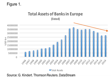 Europa ist stark von Banken abhängig. Zur Bewertung des Kredit-Ökosystems muss man zuerst die Entwicklungen im Bankensektor betrachten. Die Banken haben ihre Bilanzen seit der Krise dezimiert. 2008 betrug die Bilanzsumme der Banken in der Eurozone 33 Bio. EUR. Sie ging bis 2015 auf 28 Bio. EUR zurück (EZB, 2016). Um diese Zahl in einen Zusammenhang zu bringen: Dieser Rückgang ist höher als die zusammengelegten Bilanzen von fünf großen Banken (Rabobank, ING, ABNAMRO, Deutsche Bank und Unicredit) zum 30. Juni 2016.