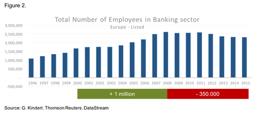 Perspektivisch wird das quantitative Lockerungsprogramm ausgeweitet, sodass jegliche Zinsanhebungen in immer weitere Ferne rücken. Dieses Umfeld zwingt die Banken dazu, mit all ihren wichtigen Ressourcen effizienter umzugehen: Personal, Branchennetzwerk, Systeme und ihre Bilanzen. In der Praxis bedeutet dies die Schließung von Filialen, Personalabbau, eine weitere Konsolidierung und ein strengeres Bilanzmanagement. Seit dem Höhepunkt 2008 wurden bis 2016 über 350.000 Jobs abgebaut. Das erscheint viel, aber von 2000 bis 2008 sind im Bankensektor fast 1 Million neue Jobs entstanden. Daher könnten noch weitere Stellen abgebaut werden. (Diese Zahlen basieren auf börsennotierten Banken, die ca. 80% der Bilanzsumme des europäischen Bankensektors ausmachen.)