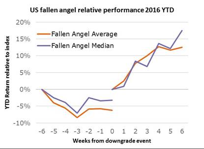 Als Investoren, die sich seit 1996 an den asiatischen Anleihemärkten engagieren, sehen wir „Fallen Angels“ vor allem als Gelegenheit, Rentenwerte zu günstigen Margen aufzunehmen. Eine von Barclays Research am US-Rentenmarkt durchgeführte Studie bestätigt unsere Erfahrung: „Fallen Angels“ schneiden zwar vor der Herabstufung schlechter ab als der Investment-Grade-Index, outperformen aber deutlich in den sechs Wochen nach der Herabstufung. Seit Beginn des Jahres haben „Fallen Angels“ in den USA den breiteren High-Yield-Markt um über 10 Prozent übertroffen und spiegeln damit ein in der Vergangenheit beobachtetes Muster in zeitlicher Nähe zu Downgrades wider.