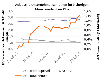 Eins hatten die Märkte vielleicht nicht in dieser Form erwartet: Asiatische US-Dollar-Anleihen erwiesen sich in den Brexit-Turbulenzen ebenfalls als sicherer Hafen. An den Märkten für asiatische Unternehmensanleihen, die traditionell als „riskante Vermögenswerte“ angesehen werden, war die Lage nach dem Referendum bemerkenswert ruhig; es gab kaum Anzeichen für Panikverkäufe. Der JPMorgan Asia Credit Index erzielte am 24. Juni eine positive Gesamtrendite in Höhe von 0,24%. Grund dafür sind die niedrigeren US-Treasury-Renditen, die eine Ausweitung der Credit Spreads zum Teil kompensierten.