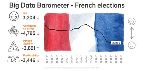 Anhand von vier Stimmungsindikatoren – Freude, Zuversicht, politische Stabilität und Berechenbarkeit – bewertet das Big Data Stimmungsbarometer von NN Investment Partners (NNIP) die Stimmung in Frankreich seit Anfang des Jahres bis in die Woche vor der zweiten Runde der Präsidentschaftswahlen. Das Barometer, das NNIP in dieser Form speziell für die Wahl in Frankreich entwickelt hat, basiert auf tausenden von Beiträgen in zahlreichen Social Media Kanälen. Zusammen ergeben sie ein Bild, das den Investmentexperten von NNIP hilft, die Stimmung rund um die französische Präsidentschaftswahl einzuschätzen. NNIP nutzt einen vergleichbaren, allerdings umfassender gehaltenen Big Data Ansatz auch in seiner Asset Allocation Strategie. Sie kombiniert eine Analyse der wirtschaftlichen Fundamentaldaten mit einer Analyse von Stimmungsindikatoren.