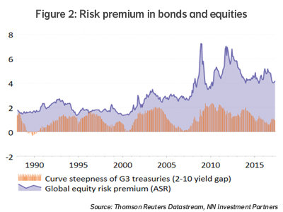 The hot topic of the day is the record-low level of expected volatility in the US equity market as embedded in the option market, and as expressed by the well-known VIX index. Meanwhile, the expected volatility of the US bond market, measured by the MOVE index, has also drifted to the lower end of its 30-year range (see Figure 1). These are interesting observations, but before drawing conclusions from them, global investors need to balance them with other metrics that describe investors’ risk appetite and behaviour. What stands out then is that the positioning of investors is still not very aggressive. Cash levels remain above long-term averages. Exposure to both bond and equity risk in active investor portfolios is not aggressive, either, and the risk premiums that investors demand in capital markets are mostly at or above average.