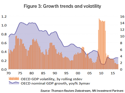 Still, one could argue that the compensation offered is not enough for the remarkably uncertain future of this time. And one could be proven right. However, it is actually much harder to prove this point than it might look at first, given the behaviour of the underlying economy or the policy and political backdrop. On many metrics the current economic and profit recovery is the strongest and most robust we have seen in at least a decade. Moreover, the behaviour of the economy has been remarkably stable is recent years (see Figure 3). Therefore, both the direction of change and the observed volatility in the underlying fundamentals give limited support to the view that markets are mispricing fundamental risks.