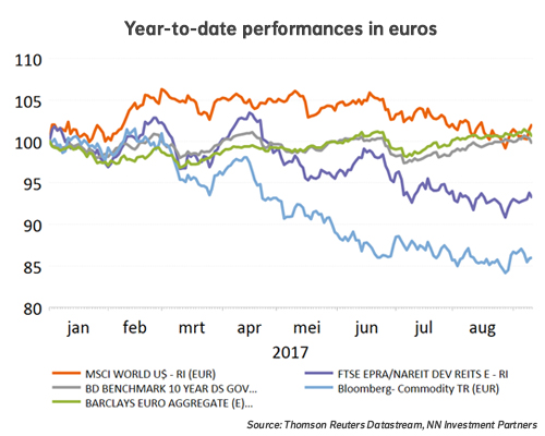 It was another good week for risky assets. In euro terms, equities rose by 1.5%, real estate by 0.7%, bond spreads came in and treasury yields rose, both in the Eurozone and the US. In the US the debt ceiling can was kicked down the road until December and North Korea did not push the button once more as some feared last weekend. The ECB meeting did not contain many surprises. The bias was slightly dovish with the ECB acknowledging the impact of the strength of the euro on inflation expectations. Our base case is that QE will be extended by at least another six months at a pace of EUR 40 billion per month. A first interest rate hike is not expected before Q2’2019. But currencies are a source of volatility.