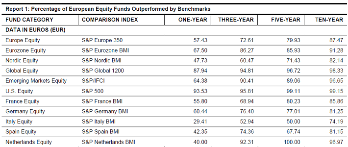 Mehr als 91 Prozent der aktiv gemanagten Fonds, die im Euroraum investieren, performten schlechter als ihr jeweiliger Vergleichsindex. Europa-Fonds, die auch außerhalb der Euro-Zone investieren, schlugen sich zwar etwas besser, und bei Italien-Fonds lieferte in den vergangenen zehn Jahren sogar jeder vierte Fondsmanager bessere Zahlen ab als der S&P Italy. Doch insgesamt bleibt die langfristige Bilanz der aktiven Fondsmanager mau. Der Vergleich von Fonds zum S&P 500 Index fällt hier besonders auf: Im 10-Jahresvergleich wäre ein aktiv gemanagter Fonds nicht einmal in einem Prozent der Fälle die bessere Wahl gewesen als ein gewöhnlicher S&P 500 Index-Tracker.