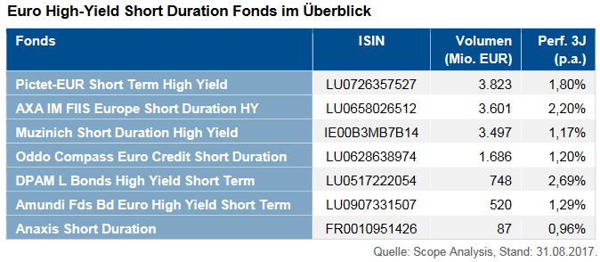 Zwar bieten Investment-Grade Unternehmensanleihen im Gegensatz zu Staatsanleihen noch eine positive Verzinsung, die Renditen befinden sich dennoch nur knapp über der Nulllinie. Zahlreiche Short-Duration-Fonds investieren daher verstärkt im unteren Investment-Grade- oder sogar High-Yield-Bereich. Einige Fonds fokussieren sich sogar überwiegend auf High-Yield-Anleihen mit kurzen Restlaufzeiten.