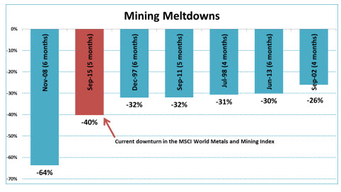 To show just how severe the ‘mining meltdown’ is, I have calculated the biggest drawdowns of the MSCI World Metals and Mining Index based on calendar month returns, since its inception in 1995. To cut to the chase right away, the graph below reveals that the current meltdown is the second biggest on record. The MSCI World Metals and Mining Index has now fallen for five consecutive months losing more than 40% of its value on the way. Only during the (six months) run up and outbreak of the global financial crisis, in 2008, did stock prices of global metals and mining companies fall more. That said; the current meltdown hasn’t come to an end, yet. October, and perhaps even the months after that, can still turn out to be ugly as well. So, while the cyclical character of mining and metals stocks leads to impressive stock price movements from time to time, the current commodity collapse has already propelled this meltdown to the second biggest on record.