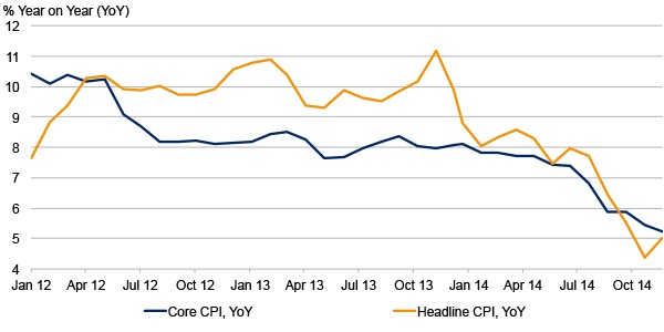 Weak commodity prices, particularly the plunging price of oil, have contributed in bringing down inflation to the current level of around 5% compared to the 11% at the end of 2013 (see Figure 1).