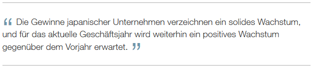Die inländischen Einnahmen japanischer Unternehmen sind relativ solide gewachsen. Trotz der weltweiten Abschwächung rechnet man weiterhin damit, dass die Unternehmensgewinne für das aktuelle Geschäftsjahr ein positives Wachstum gegenüber dem Vorjahr aufweisen. Zwar mussten die Erwartungen etwas zurückgeschraubt werden, doch das Wachstum ist ausgewogen und hängt inzwischen weniger stark von der Weltwirtschaft ab.