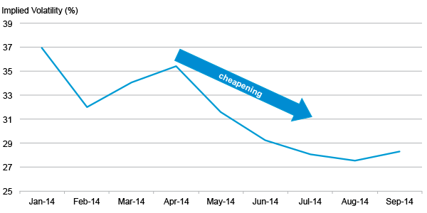 However, while regional comparison is a useful tool in identifying convertible opportunities, it can also create an overly simplistic view of the convertible bond world. A big advantage for global convertible bond managers such as Schroders is the fact that convertibles are not uniform; the market is both heterogeneous and very dynamic. It is important to have a firm research grip on the whole market, and the relevant modelling skills to pick up either under or overvaluations. Between 2009 and 2013, cheap assets were abundant, but the market now favours global convertible investors with significant research capabilities. Recent selling pressure means that convertibles now look well priced for the asymmetric return profile they offer. Implied volatility, the main measure of quantifying convertible value, stands at under 30%, which gives investors a cheap access right to long running equity market participation.