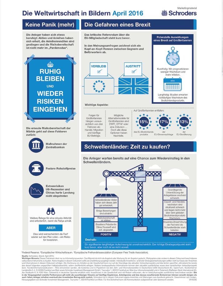 Ruhig bleiben und wieder Risiken eingehen: Die Panik scheint vorbei. Doch ein möglicher Brexit wirft seine Schatten voraus. Außerdem wirft Schroders einen Blick auf Einstiegsmöglichkeiten in den Schwellenländern.