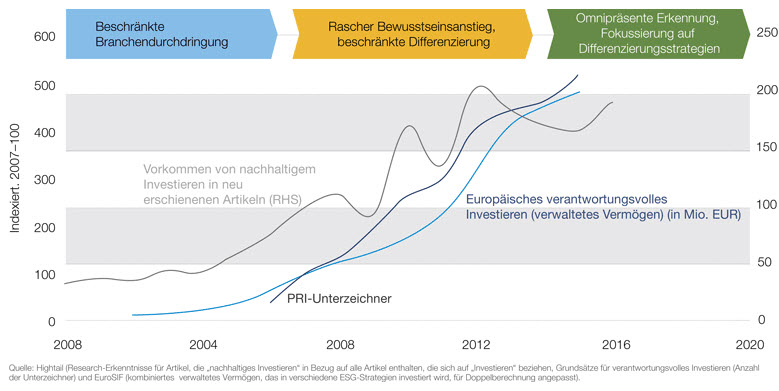 Die Tabelle zeigt den starken Anstieg der Berichterstattung über nachhaltiges Investieren in den vergangenen Jahren (die graue Linie), das Wachstum von verantwortungsbewusstemInvestmentvermögen (die blaue Linie) und die Anzahl der Unterzeichner der Grundsätze fürverantwortungsbewusstes Investieren (Principles for Responsible Investment (PRI)) (die schwarzeLinie), welche von den Vereinten Nationen unterstützt werden.