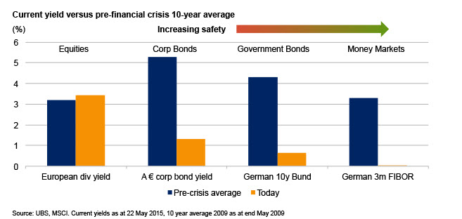 We said above that investors can find income in virtually any segment of the European stockmarket. However, in years gone by, income investors might not have considered equities at all but would typically have left their capital in bond or money market funds. That is not an option in today’s world of low interest rates and low bond yields. The dividend yields offered by European equities currently far exceed the returns available from bonds or money markets. Investors seeking income now have little alternative but to turn to equities.