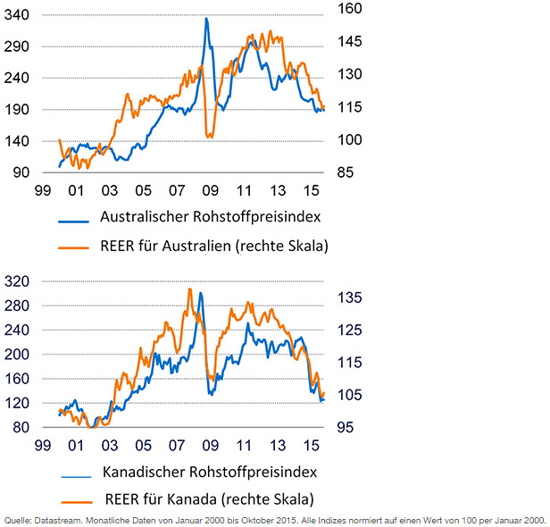 Abbildung 1: Australische und kanadische Rohstoffpreisindizes gegenüber dem realen effektiven Wechselkurs (REER)