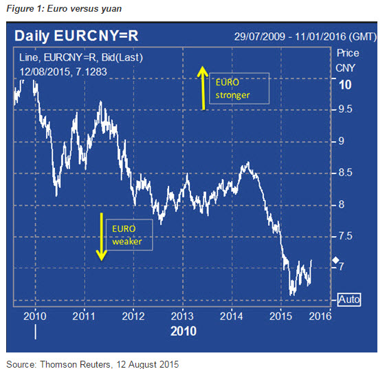 Moreover, we need to ensure that perspective is retained over the Chinese devaluation. Given the euro’s weakness against the dollar over the past year, the euro has in fact depreciated by c.2% against the renminbi over the last 12 months and is nearly 9% weaker over the past two years. Consequently, eurozone exporters are still enjoying currency tailwinds at current levels.