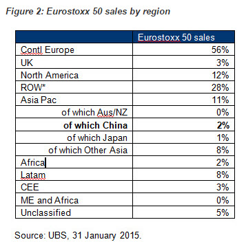 In terms of eurozone equity exposure, detailed data is limited. It is estimated that c.12% of market cap weighted sales (for Eurostoxx 50 companies) go to the Asia Pacific region, with only 2% going directly to China. We should note that these figures capture only direct sales, and do not fully reflect value added domestic sales that may ultimately become China exports. However we would estimate the exposure to earnings to be slightly higher, approximately 6%. Once again, this demonstrates the reliance on domestic European trade (c.59%). Hence we anticipate only a moderate impact from the foreign exchange move on the wider eurozone markets.