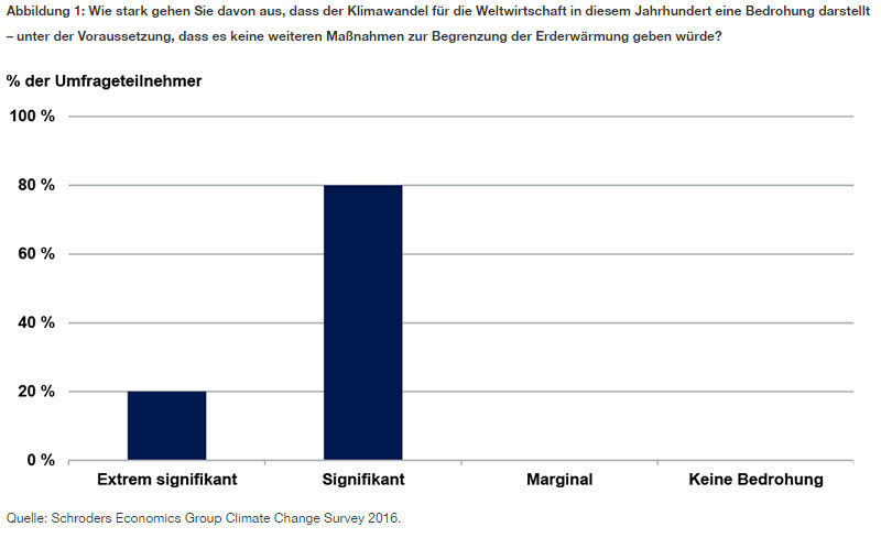 In der Umfrage zeigten sich die Teilnehmer besorgt über die mittel- und langfristigen Auswirkungen des Klimawandels auf die Weltwirtschaft: Alle Befragten gehen davon aus, dass der Klimawandel eine große oder sehr große Gefahr für die Weltwirtschaft darstellt (Abbildung 1).