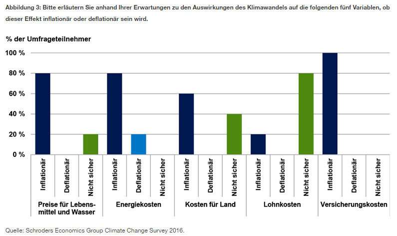 e Abbildung 3 zeigt, herrscht weitestgehend Einigkeit darüber, dass Versicherungskosten die Inflation wahrscheinlich in die Höhe treiben. Zudem nimmt die Mehrheit an, dass sich infolge des Klimawandels Lebensmittel und Wasser verteuern. Ebenfalls bemerkenswert ist die Tendenz hin zu steigenden und nicht fallenden Energiepreisen. Die größte Unsicherheit herrschte über die Auswirkungen des Klimawandels auf die Lohnkosten. Nur 20 % erwarten hier eine Steigerung, die restlichen 80 % waren sich nicht sicher.