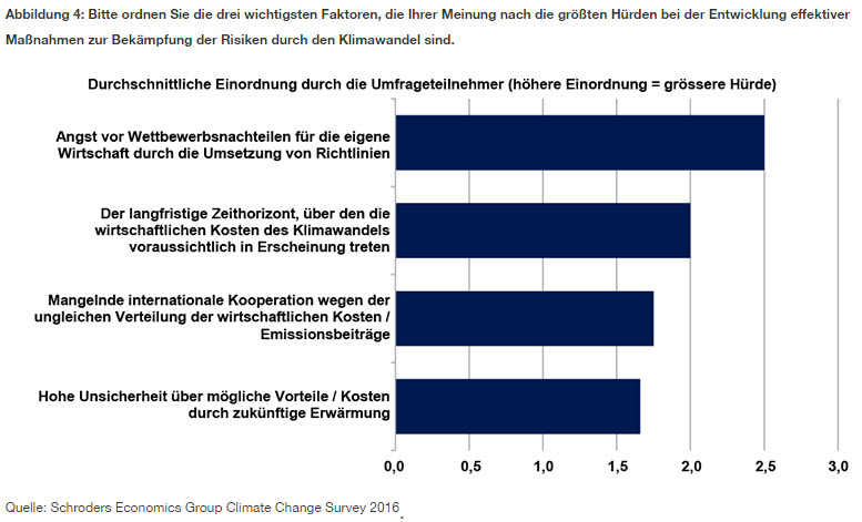 Was ist dagegen das größte Hindernis für politische Maßnahmen gegen Klimarisiken? Hier dürfte die Sorge im Vordergrund stehen, dass die eigene Volkswirtschaft international verglichen ins Hintertreffen geraten könnte.