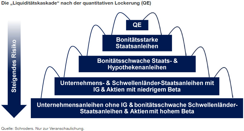 Von dort aus floss das Zentralbankgeld über die Anlagepyramide langsam weiter nach unten in Anlageklassen mit niedrigerer Qualität, als sich die Anleger auf die Suche nach höheren Renditen machten.