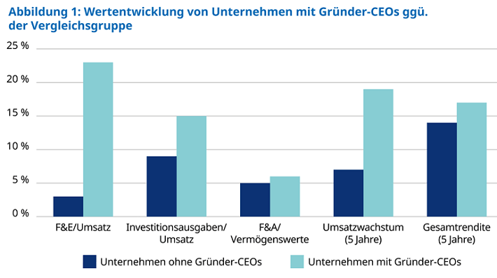 Unternehmen mit Gründer-CEOs, die in innovationsreichen Sektoren wie Internet, Software, Biotechnologie und Pharma operieren, investieren in der Regel mehr in F&E, Investitionsausgaben und F&A als ihre Vergleichsgruppe. Dies führt oft zu einem höheren Umsatzwachstum, nicht jedoch zu einer besseren Entwicklung des Aktienpreises.